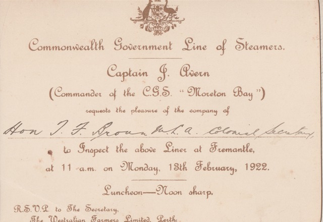 Invitation to F.T. Broun MLA to inspect a Commonwealth steamer at Fremantle