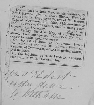 Death notice clipping for William James Broun found in Caroline Broun's Journal