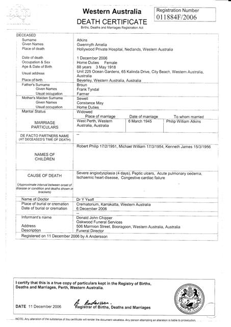 G.A. Atkins' death certificate