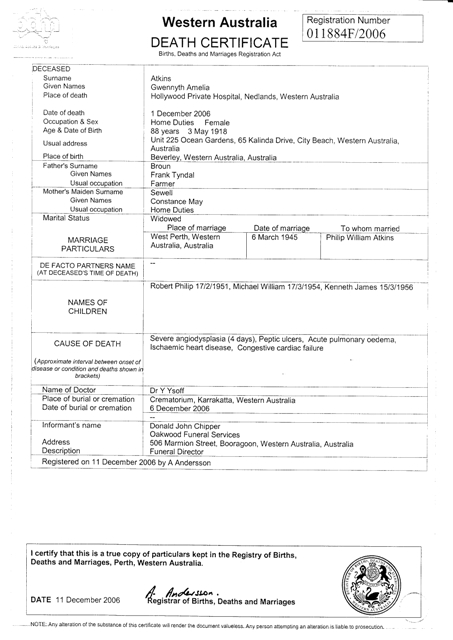 G.A. Atkins' death certificate