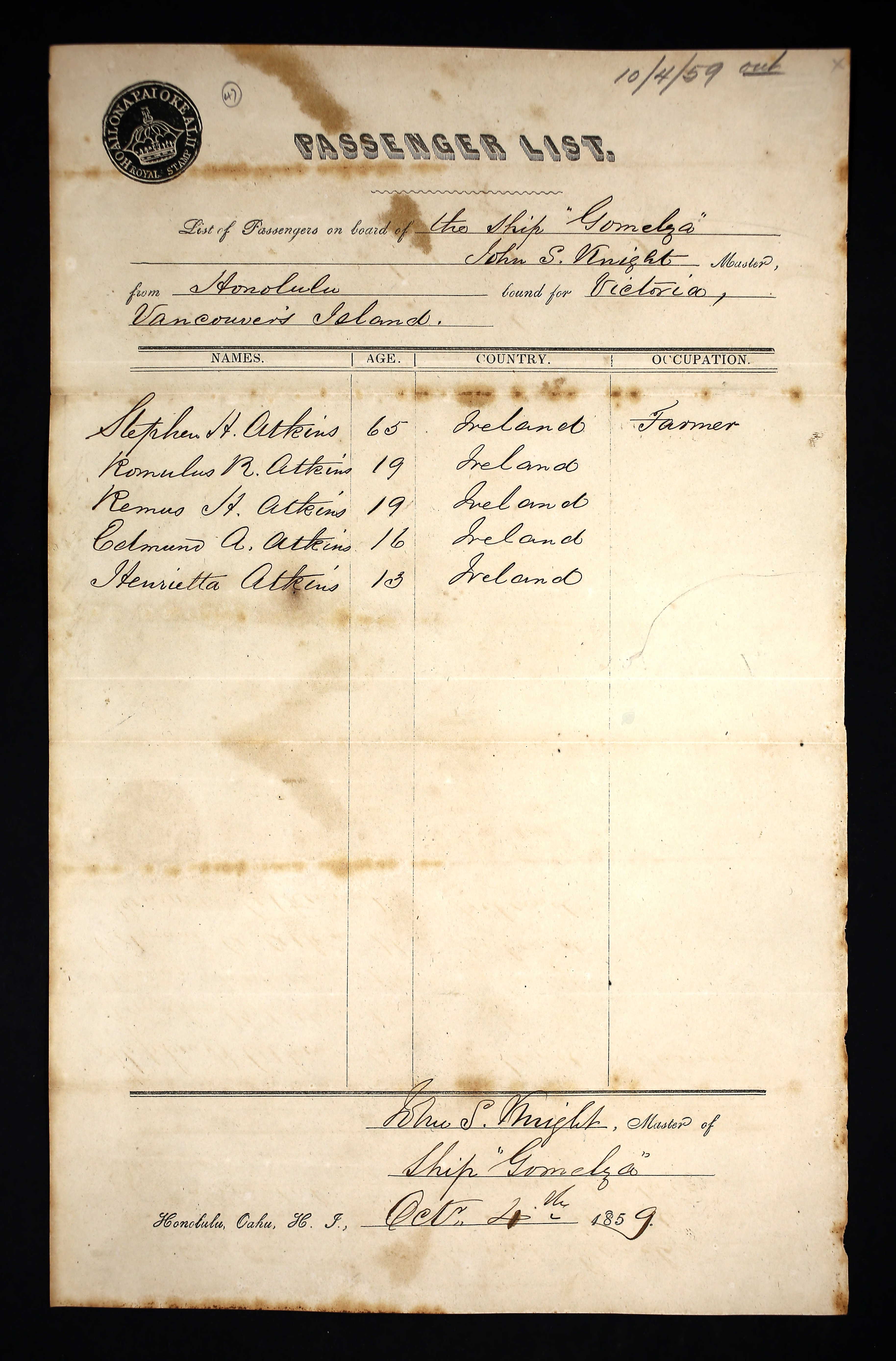 Passenger list Honolulu to Vancouver Is. 1859.