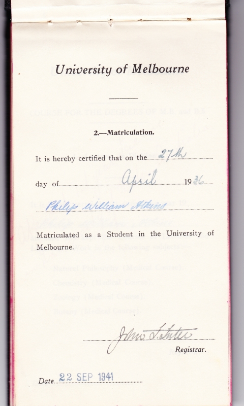 Certificate of Matriculation; University of Melbourne entrance
