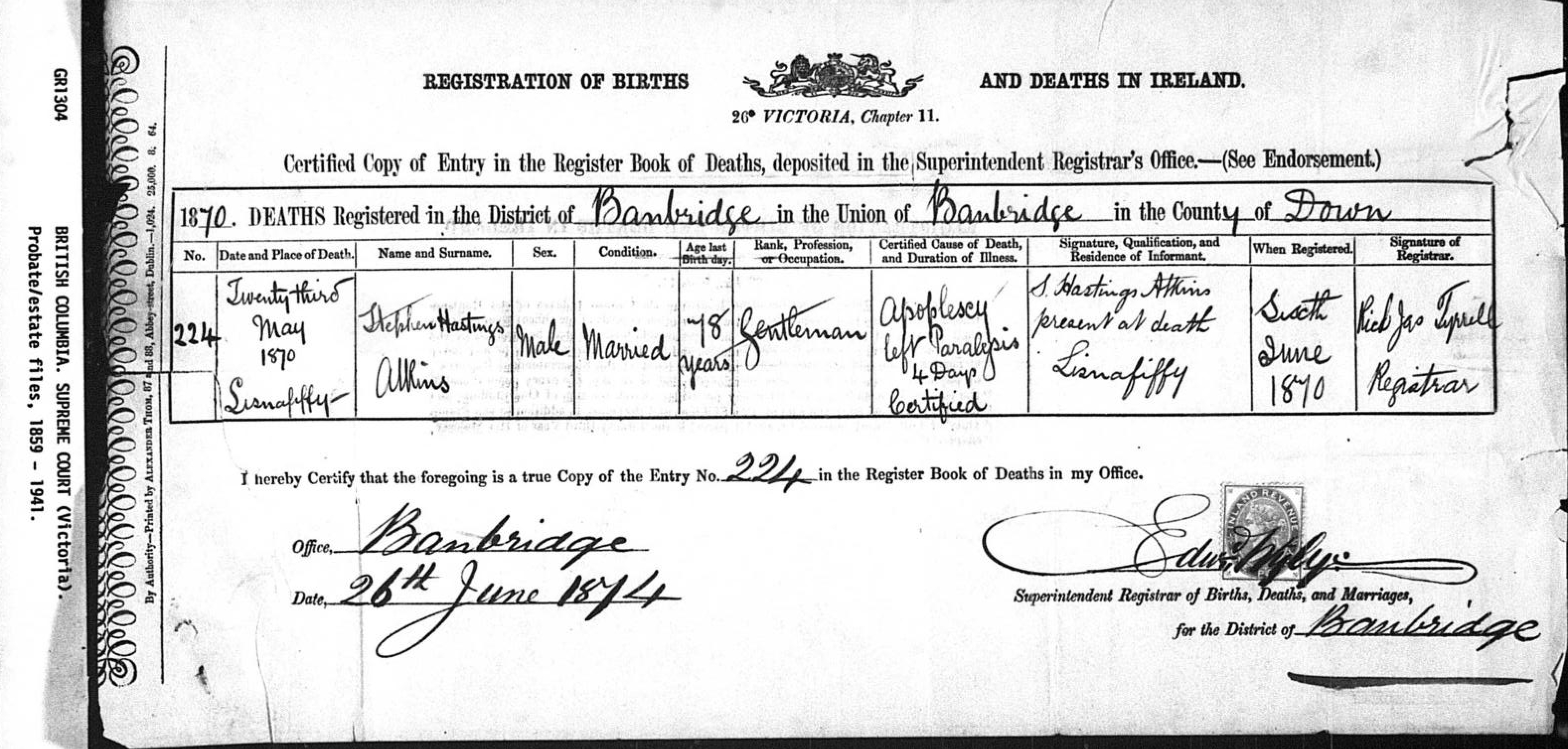 S.H. Atkins Death Certificate, attached to British Columbia Supreme Court Petition bt E.A. Atkins.
