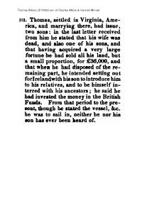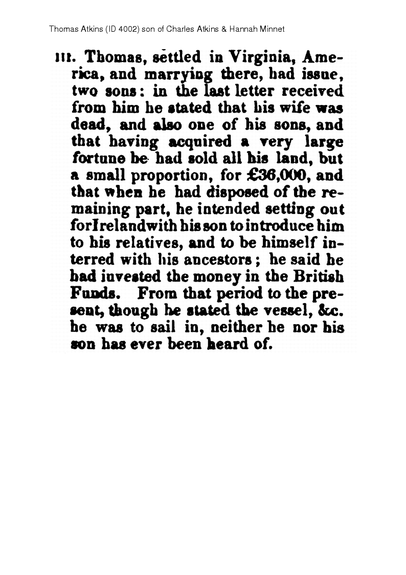 | Residence* | Thomas Atkins lived at Virginia, United States. He settled in Virginia and marrying there had issue, two sons. in a letter he stated his wife and one son had died, and that having acquied a very large fortune he was disposing of his lands and intended setting out for Ireland. Neither he nor his son were ever heard of again.1,2 |